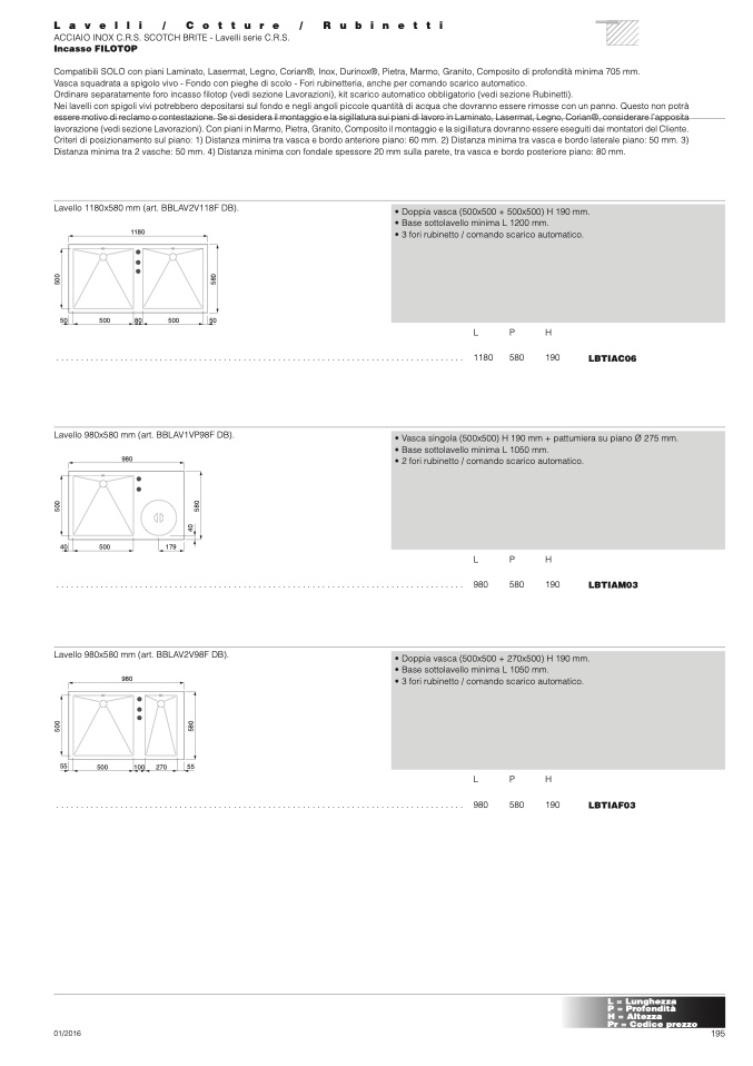 Lavello 980x580 mm (art. BBLAV1VP98F DB).