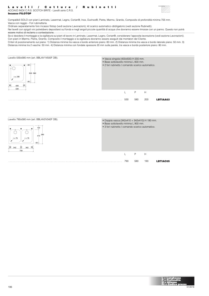 Se si desidera il montaggio e la sigillatura sui piani di lavoro in Laminato, Lasermat, Legno, Corian®, considerare l’apposita lavorazione (vedi sezione Lavorazioni).