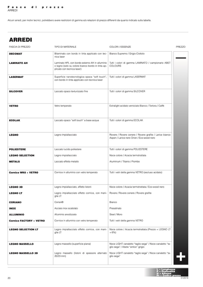 Alcuni arredi, per motivi tecnici, potrebbero avere restrizioni di gamma e/o relazioni di prezzo differenti da quanto indicato sulla tabella.