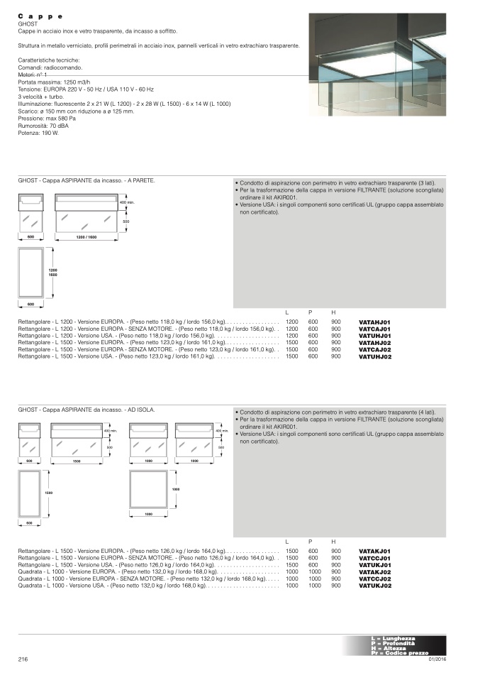 • Versione USA: i singoli componenti sono certificati UL (gruppo cappa assemblato