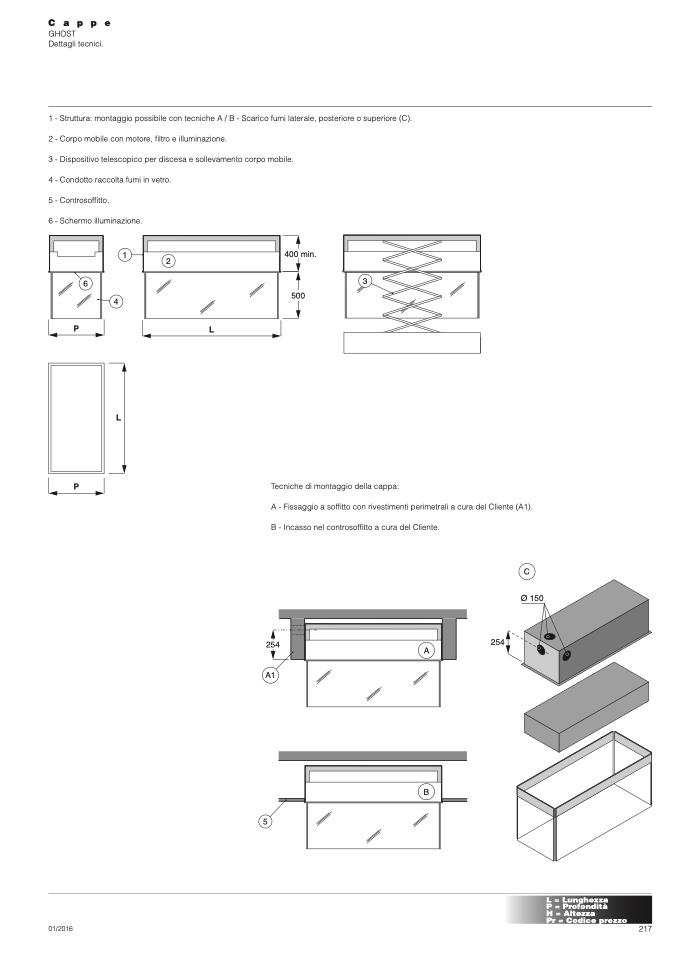1 - Struttura: montaggio possibile con tecniche A / B - Scarico fumi laterale, posteriore o superiore (C).