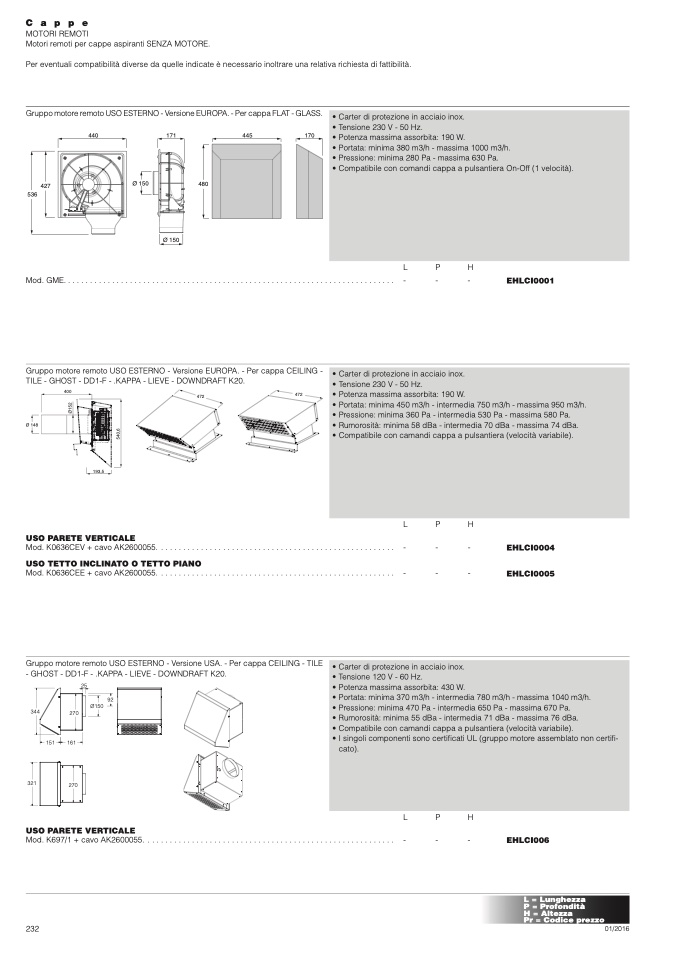 Gruppo motore remoto USO ESTERNO - Versione EUROPA. - Per cappa FLAT - GLASS.