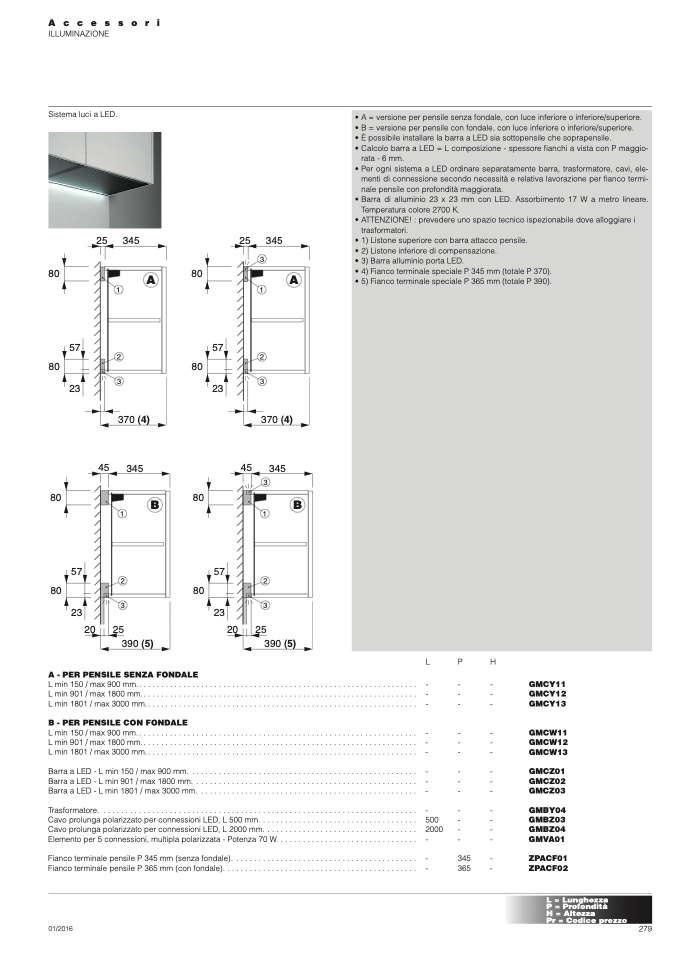 • A = versione per pensile senza fondale, con luce inferiore o inferiore/superiore.