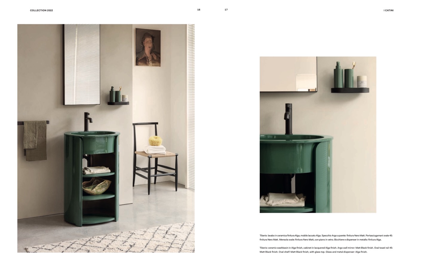 Tiberio: ceramic washbasin in Alga finish, cabinet in lacquered Alga finish. Argo wall mirror: Matt Black finish. Oval towel rail 45: