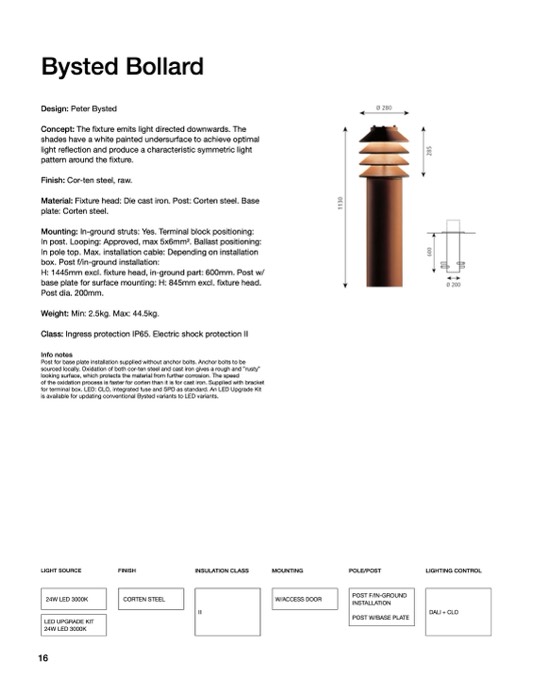 Material: Fixture head: Die cast iron. Post: Corten steel. Base