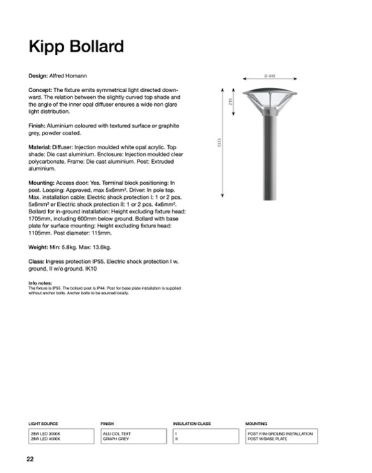 The fixture is IP55. The bollard post is IP44. Post for base plate installation is supplied