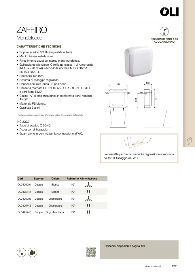 • Doppio scarico 6/3 litri (regolabile a 9/4 l)
