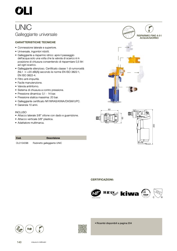• Attacco laterale 3/8” ottone con dado e guarnizione