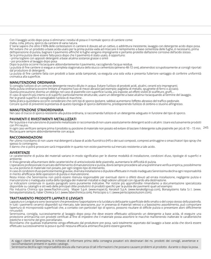Per la pulizia e manutenzione di piastrelle metallizzate si raccomanda di non usare assolutamente detergenti acidi o alcalini. Usare esclusivamente prodotti