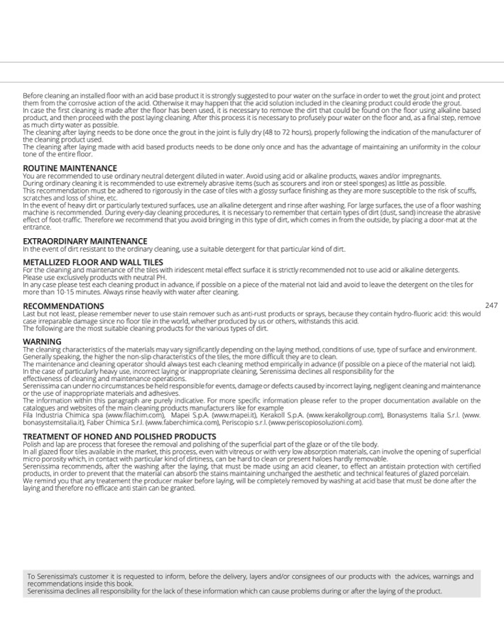 In the case of particularly heavy use, incorrect laying or inappropriate cleaning, Serenissima declines all responsibility for the