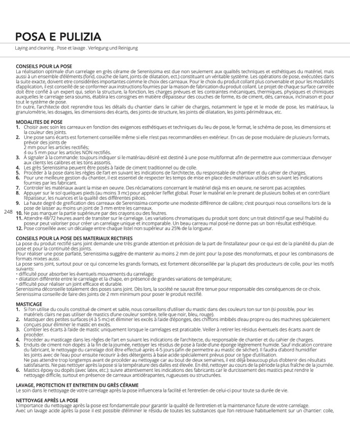 La haute degré de greification des carreaux de Serenissima comporte une modeste différence de calibre; c’est pourquoi nous conseillons lors de la