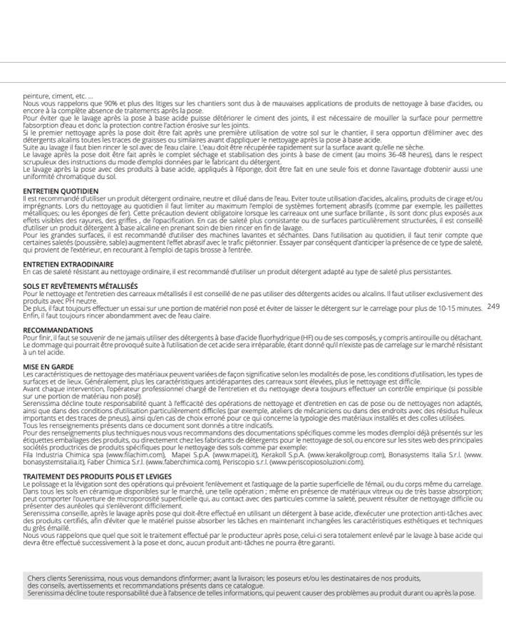 Serenissima décline toute responsabilité quant à l’efficacité des opérations de nettoyage et d’entretien en cas de pose ou de nettoyages non adaptés,