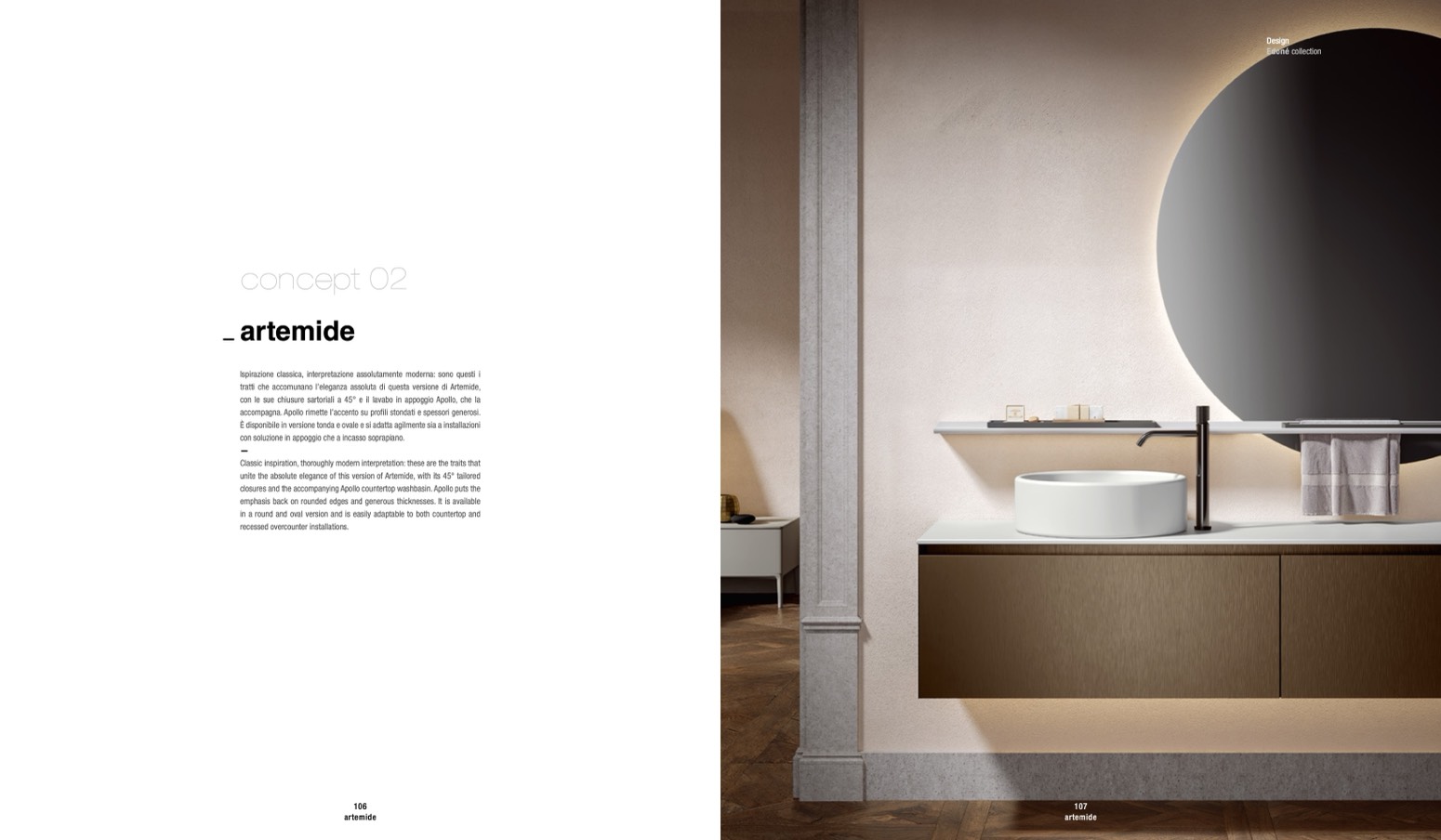 con le sue chiusure sartoriali a 45° e il lavabo in appoggio Apollo, che la