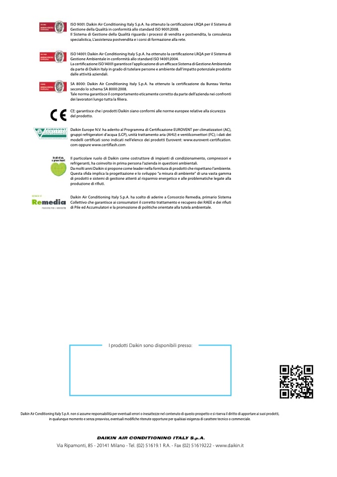 Daikin Air Conditioning Italy S.p.A. non si assume responsabilità per eventuali errori o inesattezze nel contenuto di questo prospetto e si riserva il diritto di apportare ai suoi prodotti,