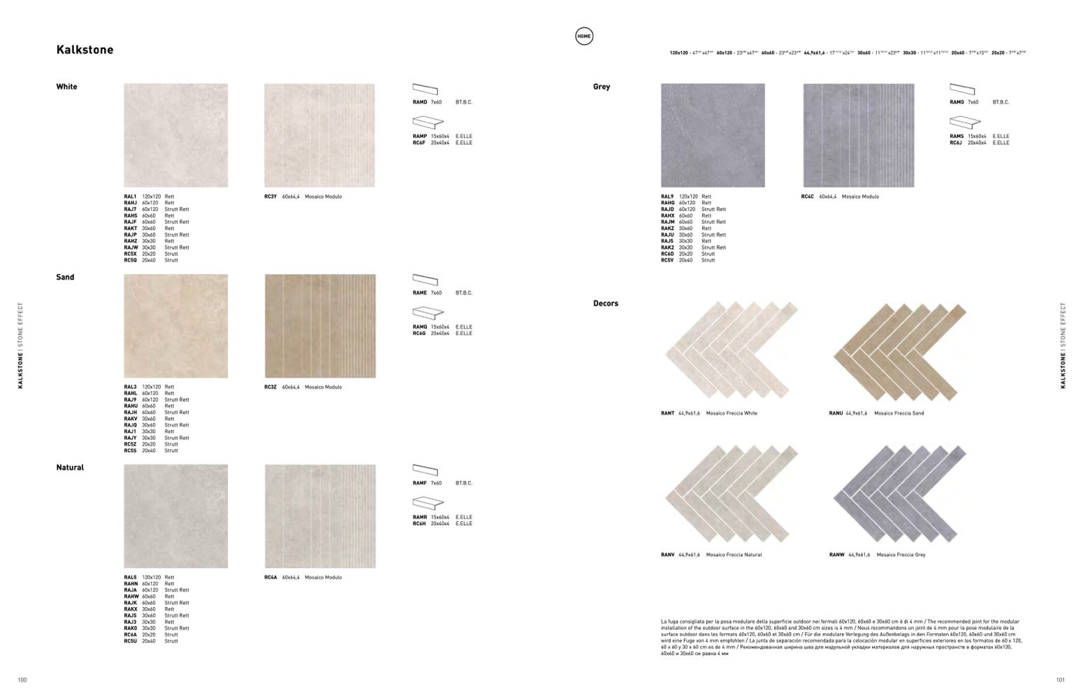 La fuga consigliata per la posa modulare della superficie outdoor nei formati 60x120, 60x60 e 30x60 cm è di 4 mm / The recommended joint for the modular