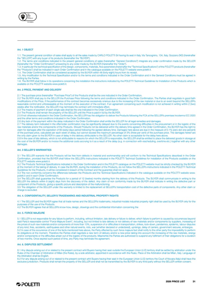fications indicated in the Order Confirmation and in the POLETTI catalogue on the POLETTI website must be strictly checked by the BUYE