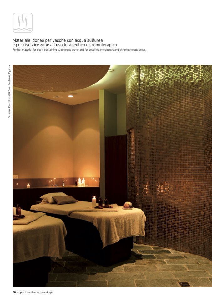 Perfect material for pools containing sulphurous water and for covering therapeutic and chromotherapy areas.