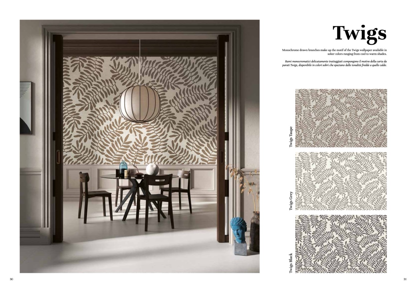 parati Twigs, disponibile in colori sobri che spaziano dalle tonalità fredde a quelle calde.