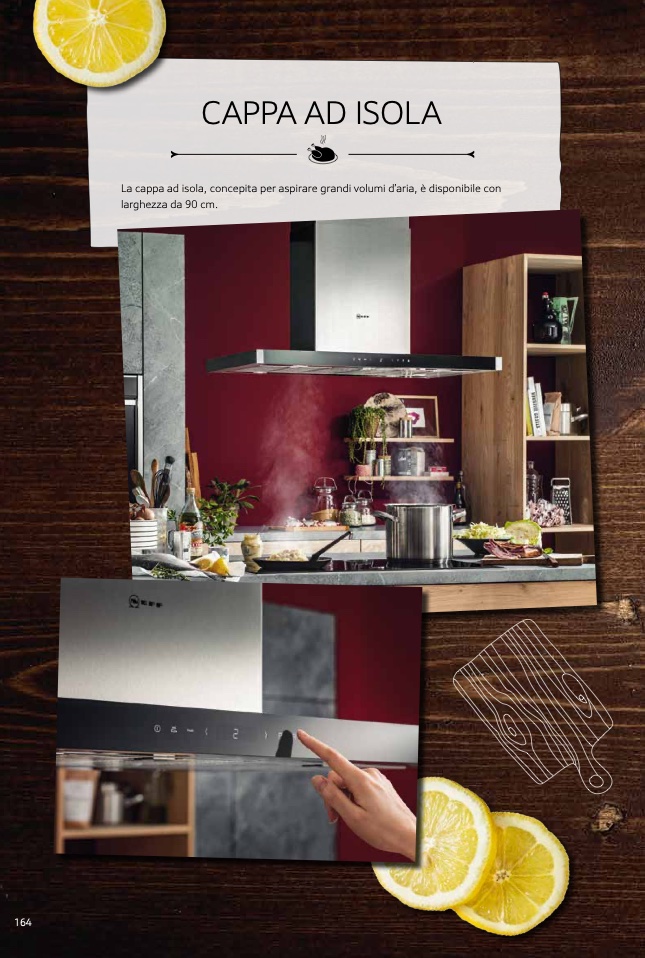 La cappa ad isola, concepita per aspirare grandi volumi d’aria, è disponibile con