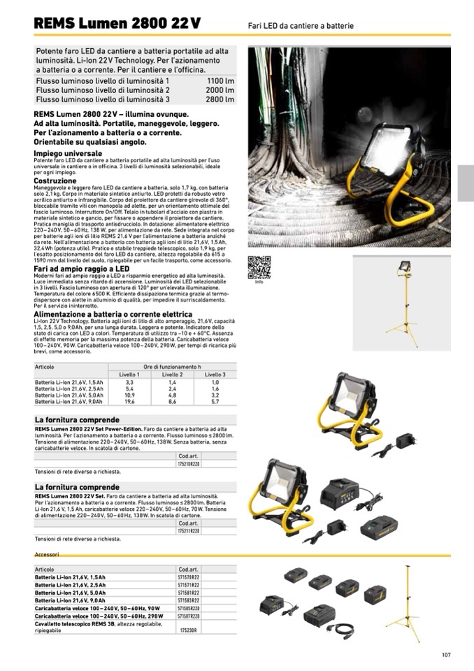 Per l’azionamento a batteria o a corrente. Flusso luminoso ≤ 2800 lm. Batteria