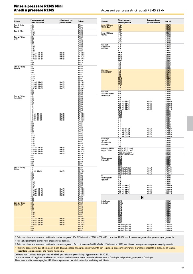 I sistemi pressfitting per gli impianti a gas devono essere eseguiti esclusivamente con le pinze a pressare Mini/anelli a pressare indicate in giallo nella tabella.