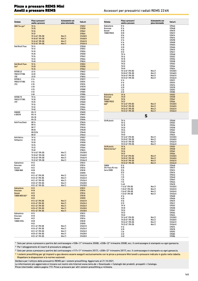 I sistemi pressfitting per gli impianti a gas devono essere eseguiti esclusivamente con le pinze a pressare Mini/anelli a pressare indicate in giallo nella tabella.