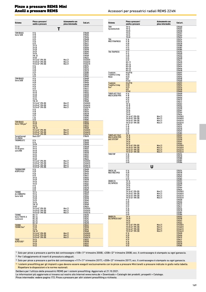 I sistemi pressfitting per gli impianti a gas devono essere eseguiti esclusivamente con le pinze a pressare Mini/anelli a pressare indicate in giallo nella tabella.