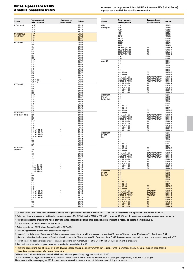 I sistemi pressfitting per gli impianti a gas devono essere eseguiti esclusivamente con le pinze/anelli a pressare REMS indicate in giallo nella tabella.