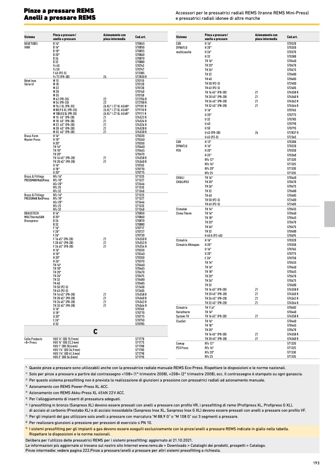 I sistemi pressfitting per gli impianti a gas devono essere eseguiti esclusivamente con le pinze/anelli a pressare REMS indicate in giallo nella tabella.
