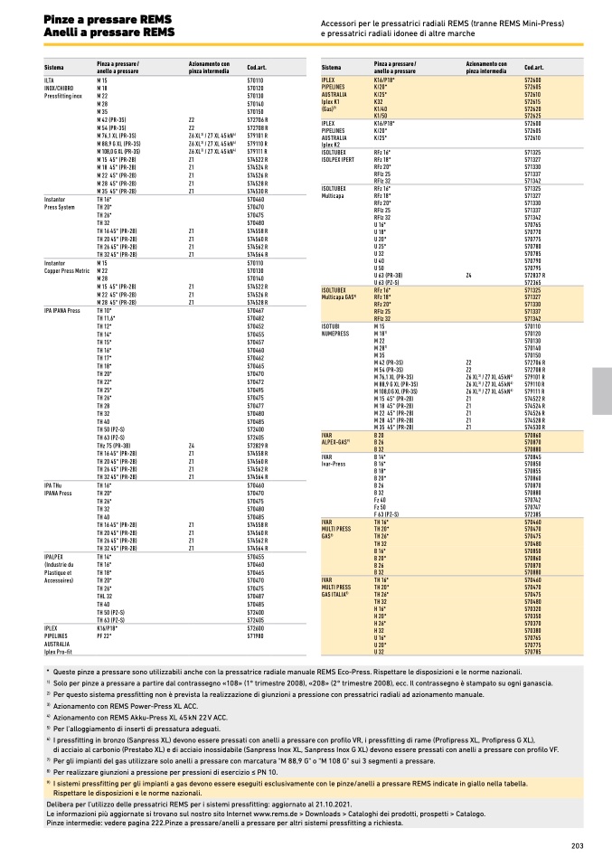 I sistemi pressfitting per gli impianti a gas devono essere eseguiti esclusivamente con le pinze/anelli a pressare REMS indicate in giallo nella tabella.