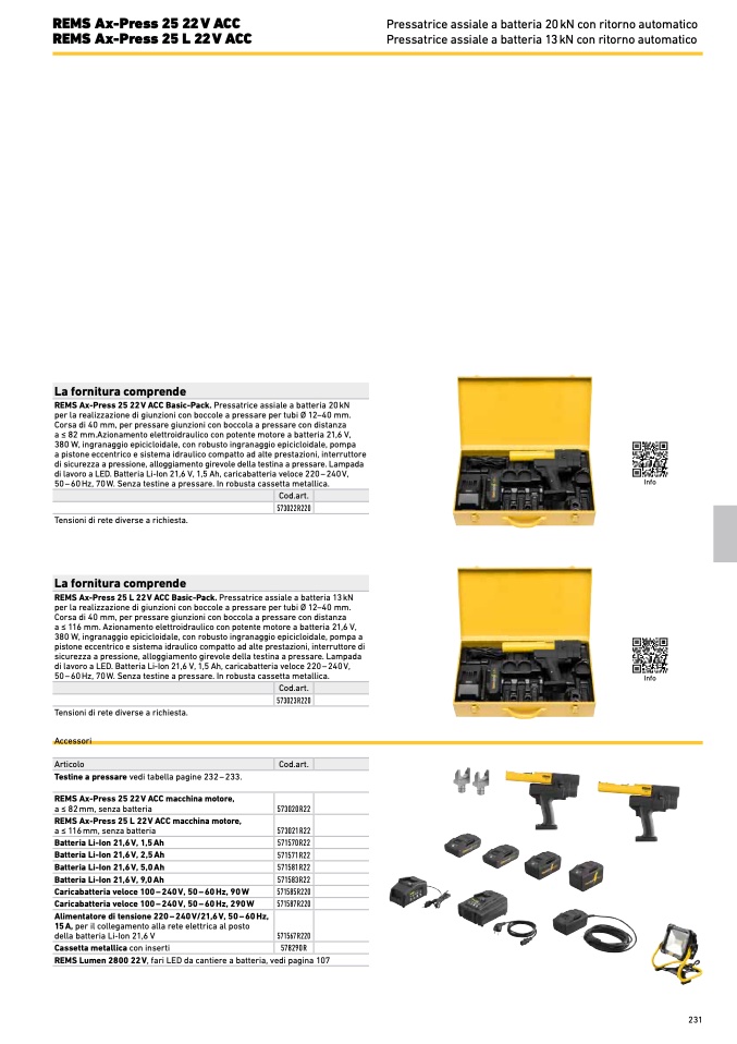 REMS Ax-Press 25 L 22 V ACC Basic-Pack. Pressatrice assiale a batteria 13 kN