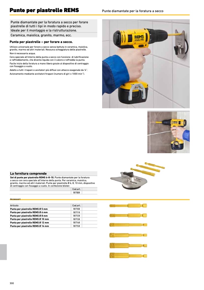 granito, marmo ed altri materiali. Punte per piastrelle Ø 6, 8, 10 mm, dispositivo