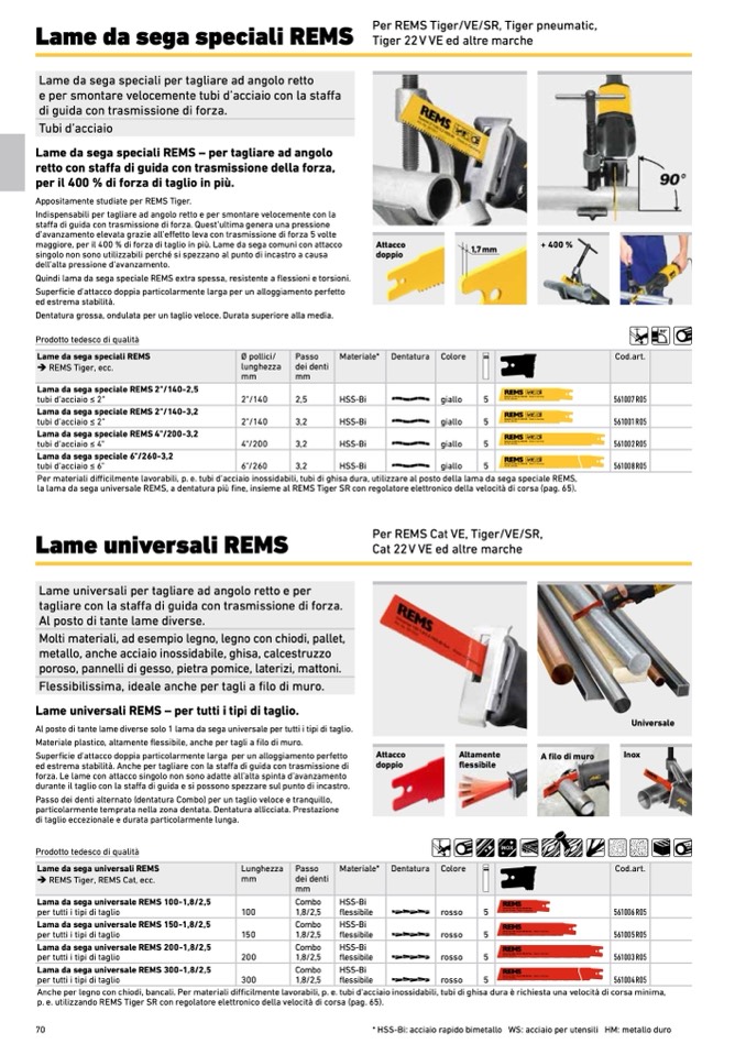 la lama da sega universale REMS, a dentatura più fine, insieme al REMS Tiger SR con regolatore elettronico della velocità di corsa (pag. 65).