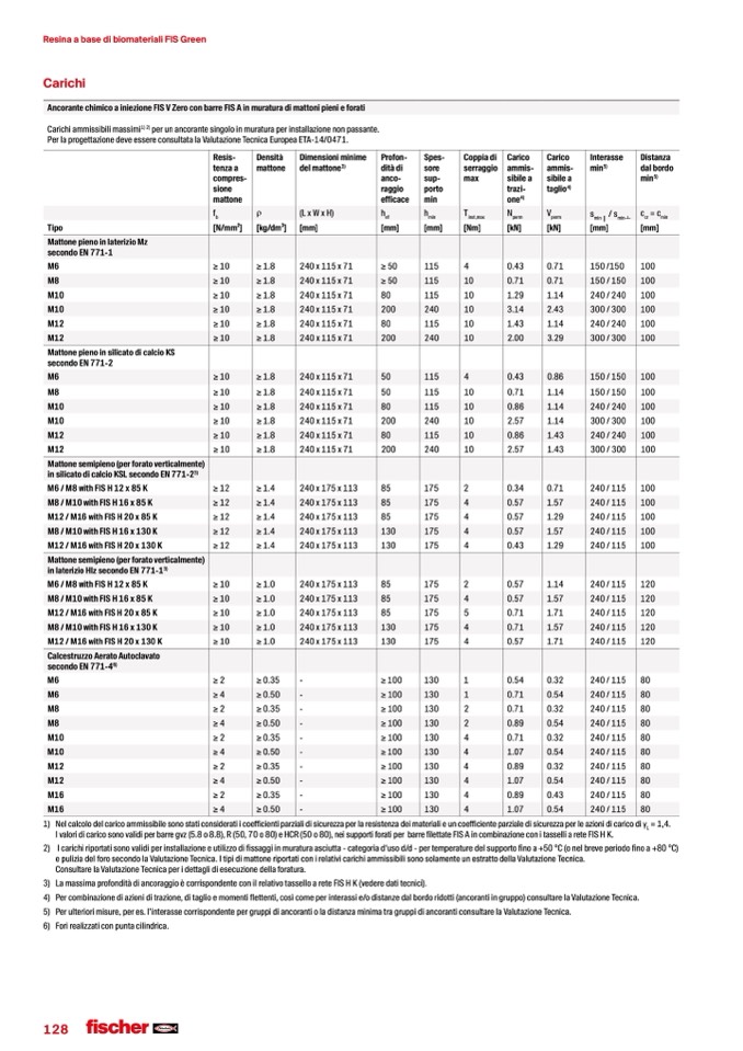 2) I carichi riportati sono validi per installazione e utilizzo di fissaggi in muratura asciutta - categoria d‘uso d/d - per temperature del supporto fino a +50 °C (o nel breve periodo fino a +80 °C)