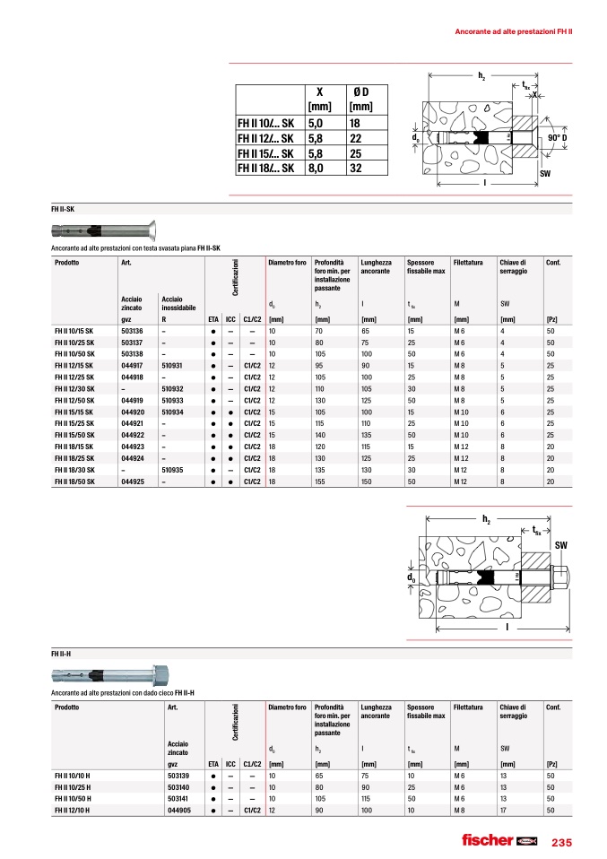 Ancorante ad alte prestazioni con testa svasata piana FH II-SK