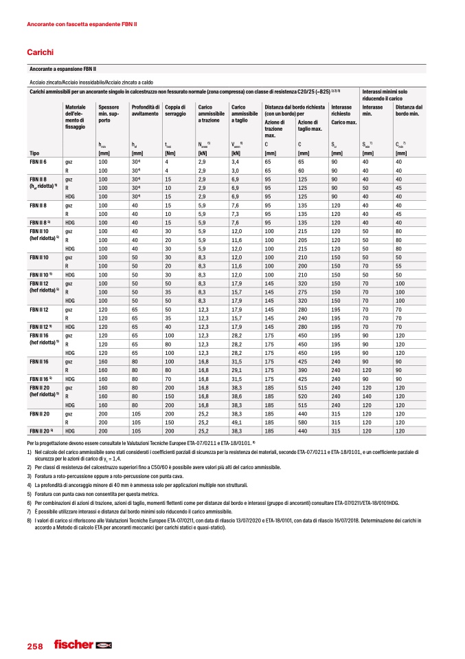 1) Nel calcolo del carico ammissibile sono stati considerati i coefficienti parziali di sicurezza per la resistenza dei materiali, secondo ETA-07/0211 e
