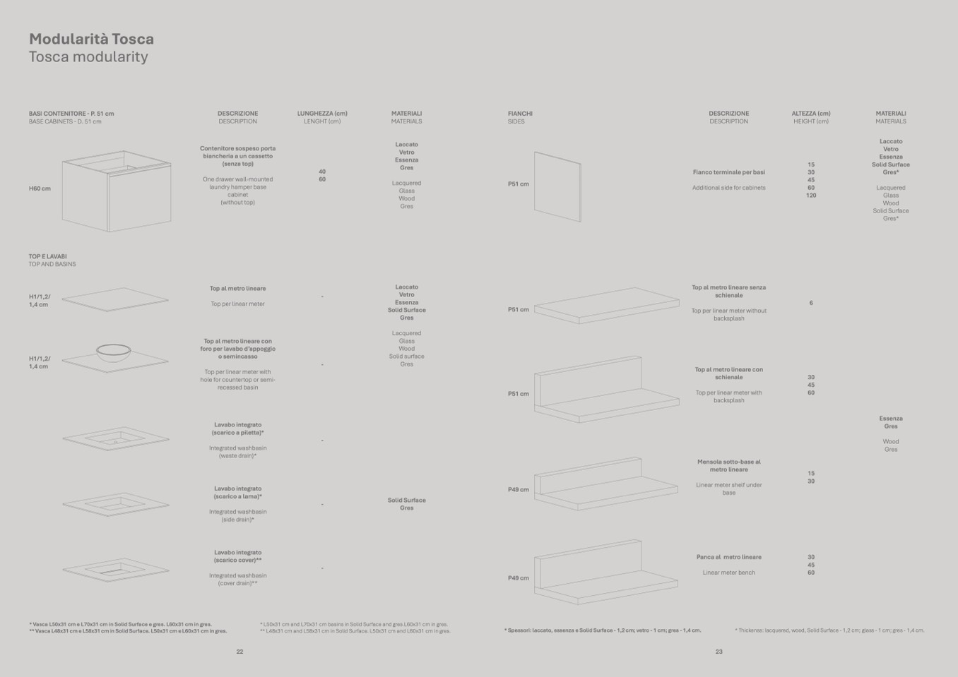 * Spessori: laccato, essenza e Solid Surface - 1,2 cm; vetro - 1 cm; gres - 1,4 cm