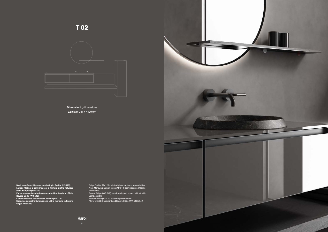 Mirror with LED backlight and Rovere Grigio (WR.542) shelf.