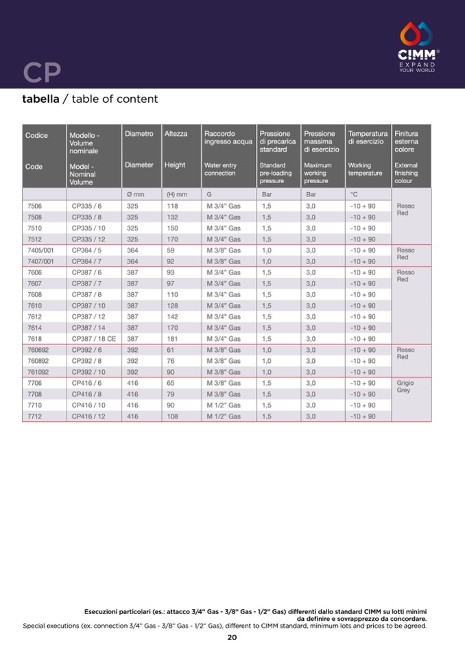 Special executions (ex. connection 3/4” Gas - 3/8” Gas - 1/2” Gas), different to CIMM standard, minimum lots and prices to be agreed.