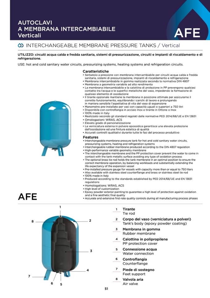 • Serbatoio a pressione con membrana intercambiabile per circuiti acqua calda e fredda