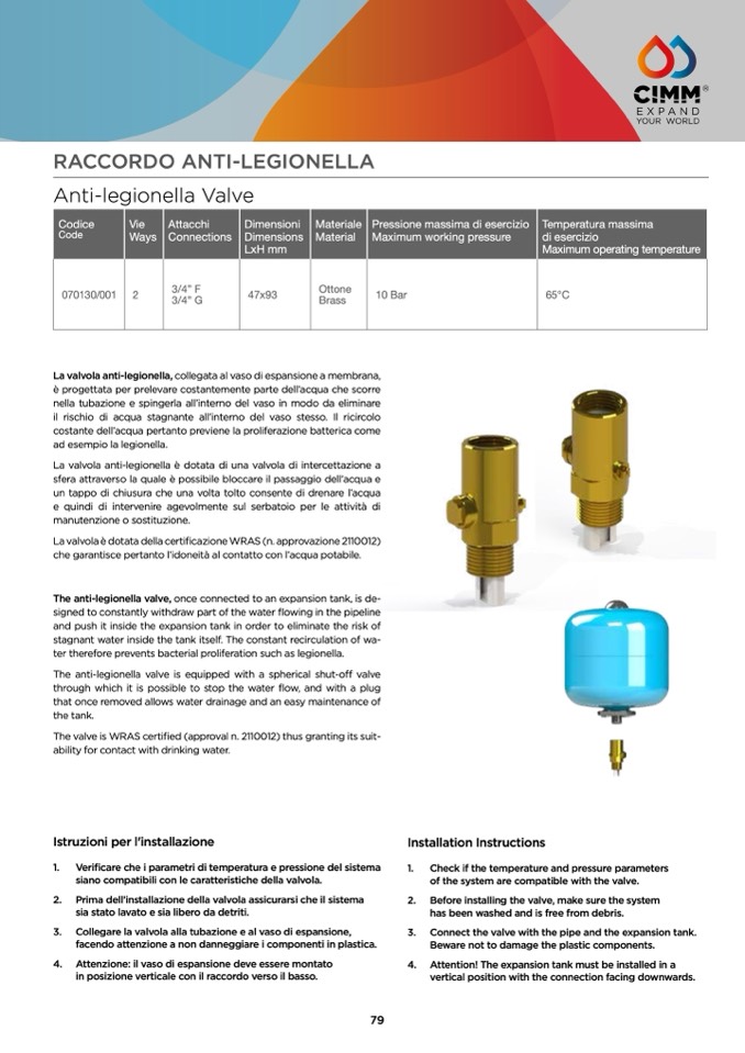 The anti-legionella valve, once connected to an expansion tank, is de-