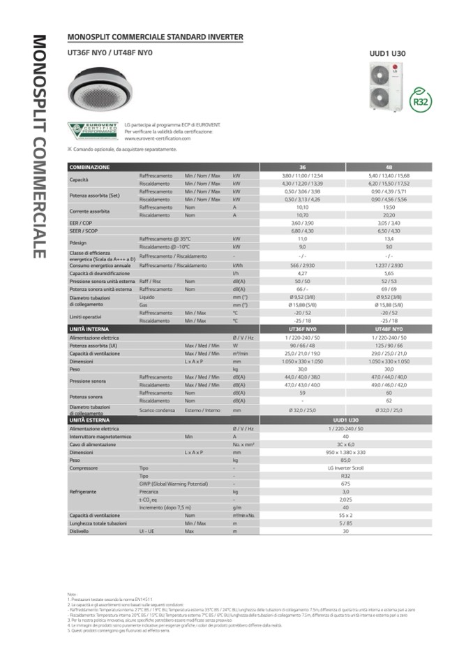 - Raffreddamento: Temperatura interna 27°C BS / 19°C BU, Temperatura esterna 35°C BS / 24°C BU, lunghezza delle tubazioni di collegamento 7.5m, differenza di quota tra unità interna e esterna pari a zero