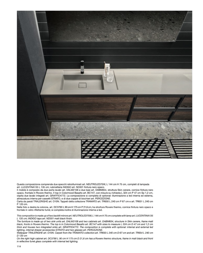 art. LUCENTINA135 L 135 cm; rubinetteria INDIGO art. ND301 finitura nero opaco.
