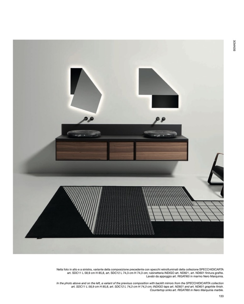 art. SDC11 L 58,9 cm H 85,8, art. SDC12 L 74,3 cm H 74,3 cm; INDIGO taps art. ND921 and art. ND601 graphite finish.
