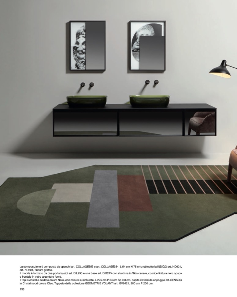 La composizione è composta da specchi art. COLLAGE353 e art. COLLAGE354, L 54 cm H 75 cm; rubinetteria INDIGO art. ND921,