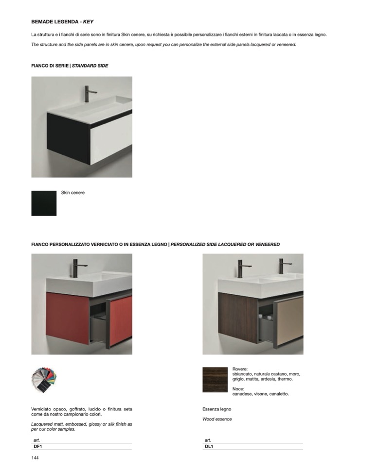 The structure and the side panels are in skin cenere, upon request you can personalize the external side panels lacquered or veneered.