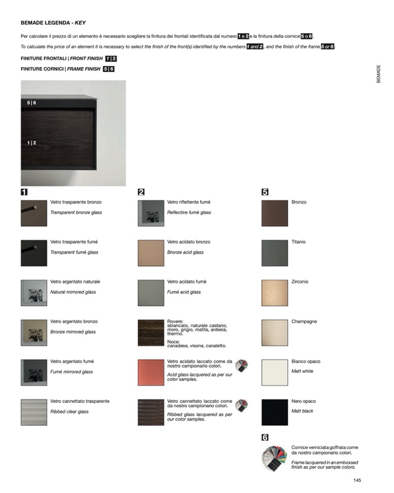 Per calcolare il prezzo di un elemento è necessario scegliere la finitura dei frontali identificata dal numero 1 e 2 e la finitura della cornice 5 o 6 .