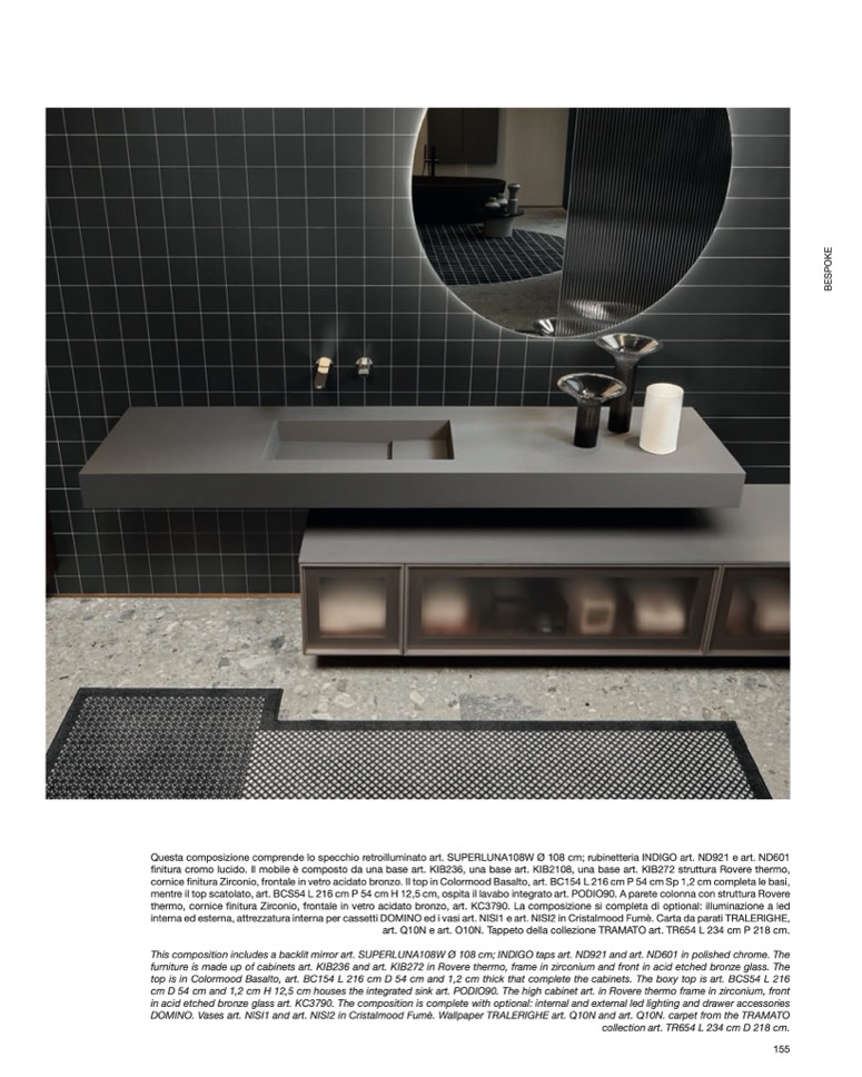 Questa composizione comprende lo specchio retroilluminato art. SUPERLUNA108W Ø 108 cm; rubinetteria INDIGO art. ND921 e art. ND601