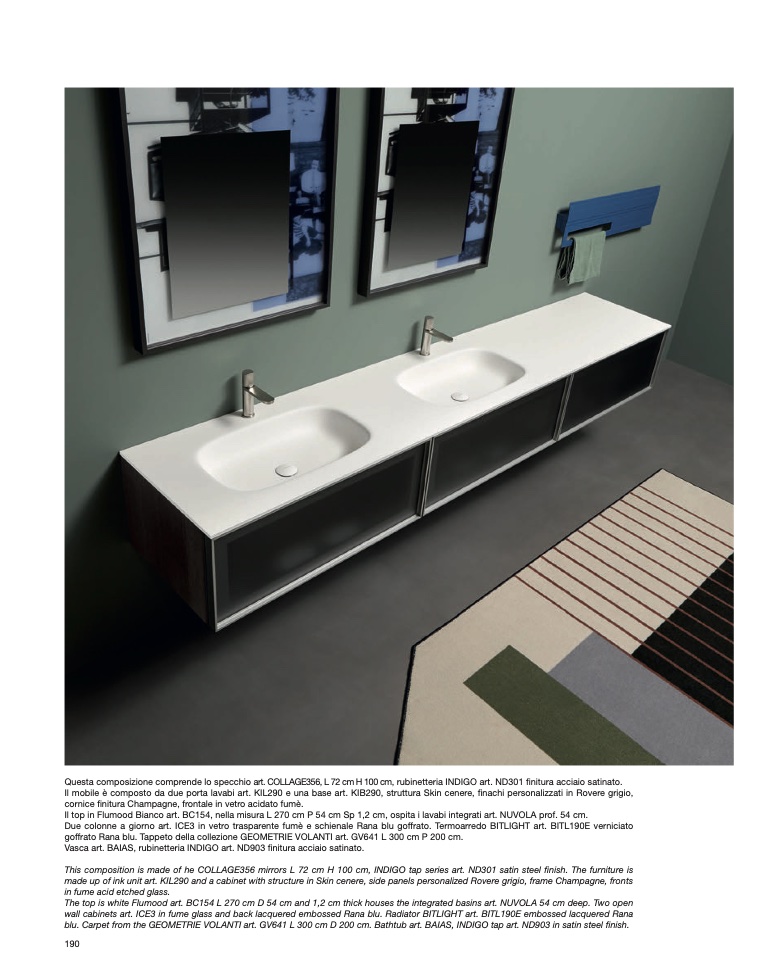 Questa composizione comprende lo specchio art. COLLAGE356, L 72 cm H 100 cm, rubinetteria INDIGO art. ND301
