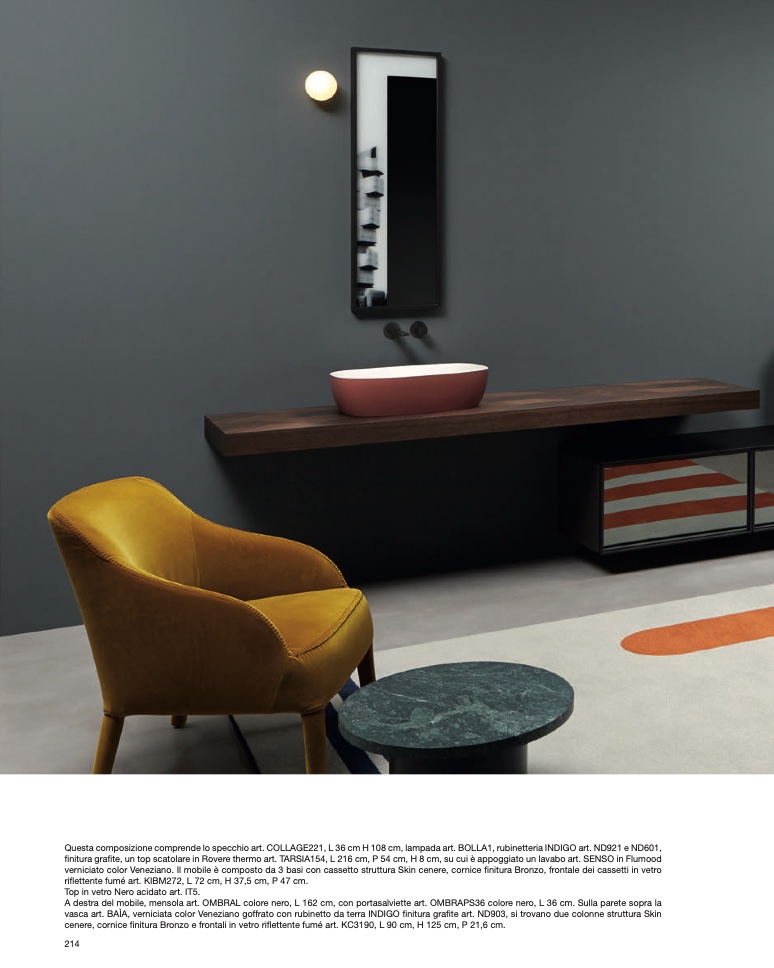 Questa composizione comprende lo specchio art. COLLAGE221, L 36 cm H 108 cm, lampada art. BOLLA1, rubinetteria INDIGO art. ND921 e ND601,